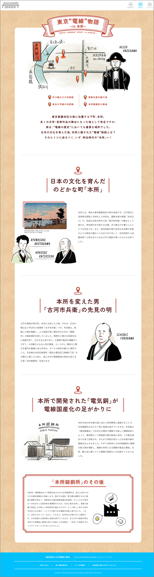 日本電線工業会様のウェブコンテンツ『DISCOVERY DENSEN』の「東京電線物語 in 本所」の記事内で、えなみかなおのイラストを使っていただいております。今回は、長谷川平蔵や芥川龍之介、墨田区本所のマップを描きました。(担当:藤間)