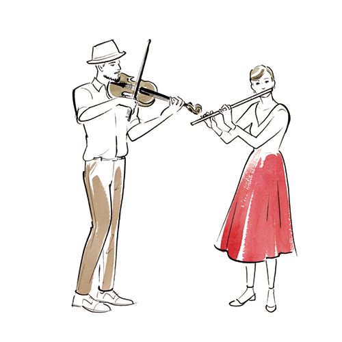 高篠裕子が広告用のイラストを制作しました。マルシェでお買い物をする女性のイラスト、カフェでくつろぐ男性のイラスト、家族4人でお出掛けするイラスト、バイオリンやフルートで演奏する男女のイラスト、洋服屋さんでショッピングする女性のイラスト、絵画鑑賞をする女性のイラストを制作しました。