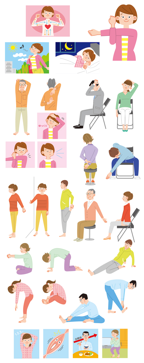 健康情報誌『Life』にて山口絵美がイラストを制作しました。ストレッチのメリットや誰でもできる悩み別のストレッチ、ストレッチを行う時の3つの基本など、ストレッチで行う体のメンテナンスについての説明用イラストです。