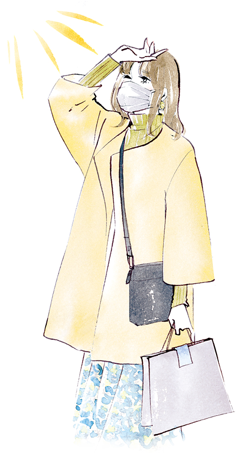 アルソアライフで中谷聖子がイラストを制作しました。春の街中を楽しそうに散歩している女性と冷え対策説明用のイメージイラストです。