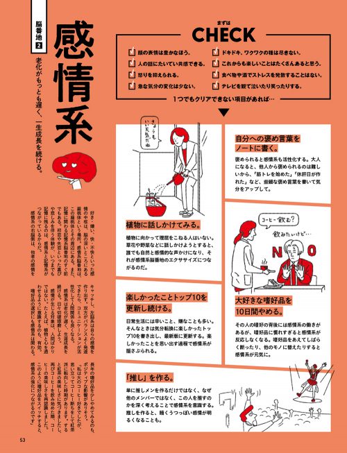 マガジンハウス様発行の雑誌Tarzan(ターザン)の特集「手軽にできる脳トレ34。」(監修_脳内科医 加藤俊徳さん)のイラストをフジノマが制作しました。脳を機能ごとに8つのパーツに区分けし、日常の簡単な行動がそれぞれの部位に与える影響をイラストを使って紹介しています。扉には脳のイラスト、各ページで8つのパーツへ影響を与える日常のシチュエーションイラスト、テーマにあわせた「脳ちゃん」のイラストを制作しました。