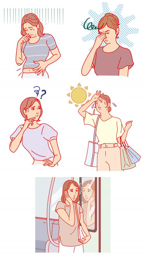 会報誌「ハーバーの美容手帖」で安藤直がイラストを制作しました。疲れ目の女性やぽっこりお腹でスカートが入らない女性、暑さでちょっとした買い物でも疲れてしまっている女性などのイメージイラストです。