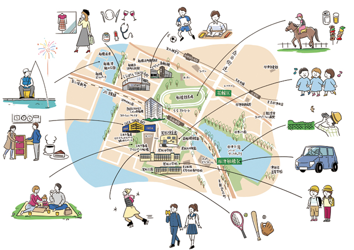 リクルート様発行のフリーペーパー「SUUMO」およびサイト内のマップイラストをえなみかなおが制作しました。南船橋付近のマップイラストと近隣のショッピングモールなどの建物イラスト、そこに集う大人や子供のイラストを制作しました。