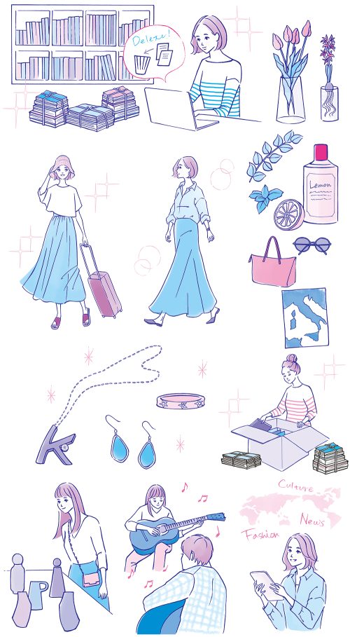 女性が友人と話している様子、自然の写真を撮る姿、ショッピングを楽しんでいる様子、鏡を見ながらメイクをしている女性、旅行を楽しんでいるシーン、本棚やデータを整理しているシーン、カフェで友人とコーヒーブレイクを楽しんでいる女性、運動中の女性、休日を過ごすリラックスした瞬間、健康的な食事を楽しむシーンなどの日常生活、またフレッシュなドリンクやデザート、洋服やアクセサリーなどのファッションに関するアイテムを女性らしく落ち着いた、柔らかい表現で戸村桂子が描きました。